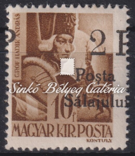 Leírás | 1945. Zilah (I.) 2P/10f bélyegen látványosan elcsúszott a felülnyomat! III. típus Bodor M. bélyegszakértő bevizsgáló jelével. / 1945. Zilah (I.) Spectacularly slipped overprint on 2P/10f stamp! Type III. With the stamp expert, M. Bodor's proof sign on the backside. |