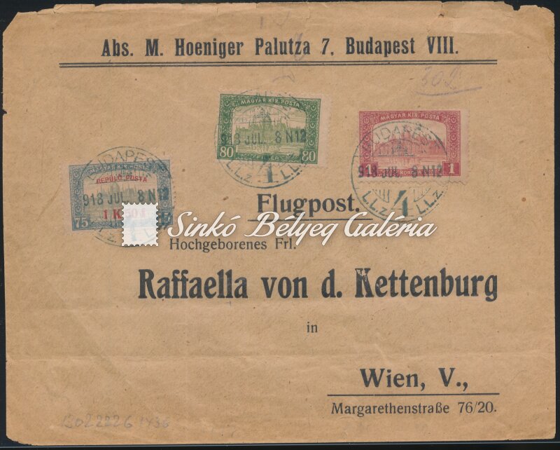 Leírás | 1918.07.08. Légiposta levél BUDAPEST-WIEN között. 80f+1K Parlament és 1K50f/75f Légiposta bélyegekkel bérmentesítve. / 1918.07.08. Airmail letter between BUDAPEST-WIEN. Franked with 80f+1K Parliament and 1K50f/75f Airmail stamps. |