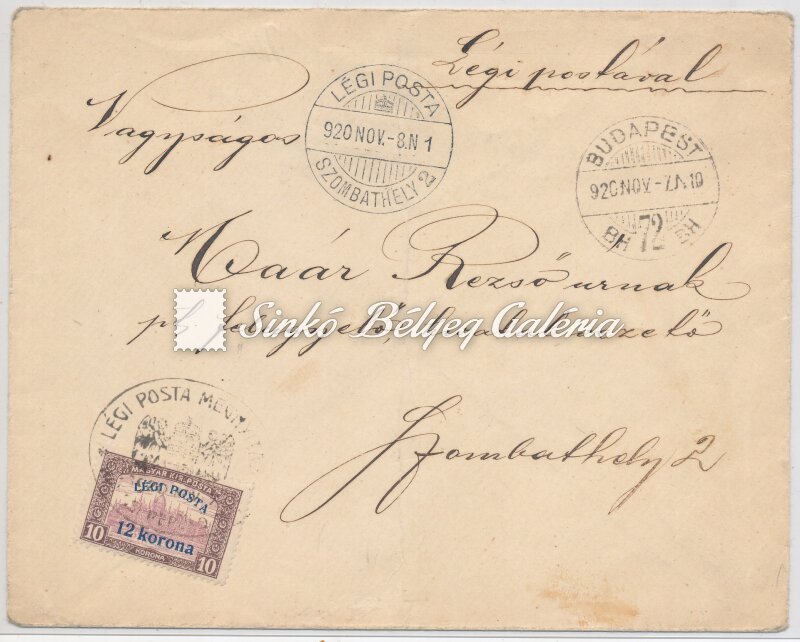 Leírás | 1920.11.08. Légiposta levél BUDAPEST-SZOMBATHELY között. 12K/10K bélyeggel bérmentesítve. / 1920.11.08. Airmail letter between BUDAPEST-SZOMBATHELY. Franked with a 12K/10K stamp. |