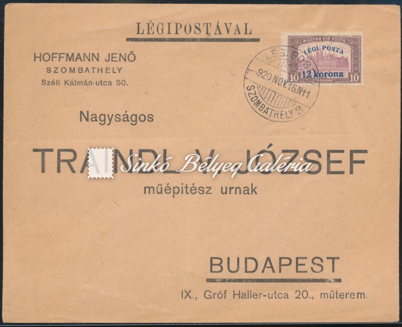 Leírás | 1920.11.16. Légiposta levél SZOMBATHELY-BUDAPEST között. Egybélyeges bérmentesítés! / 1920.11.16. Airmail letter between SZOMBATHELY-BUDAPEST. One stamp franking! |