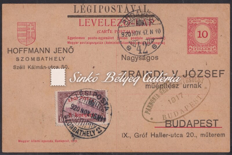 Leírás | 1920.11.16. Légiposta levél SZOMBATHELY-BUDAPEST között. 10f díjjegyes UPU Levelező-lapon 3K/10K bélyegkiegészítéssel bérmentesítve! / 1920.11.16. Airmail letter between SZOMBATHELY-BUDAPEST. On a 10f postal stationery UPU postcard supplied and franked with a 3K/10K stamp! |
