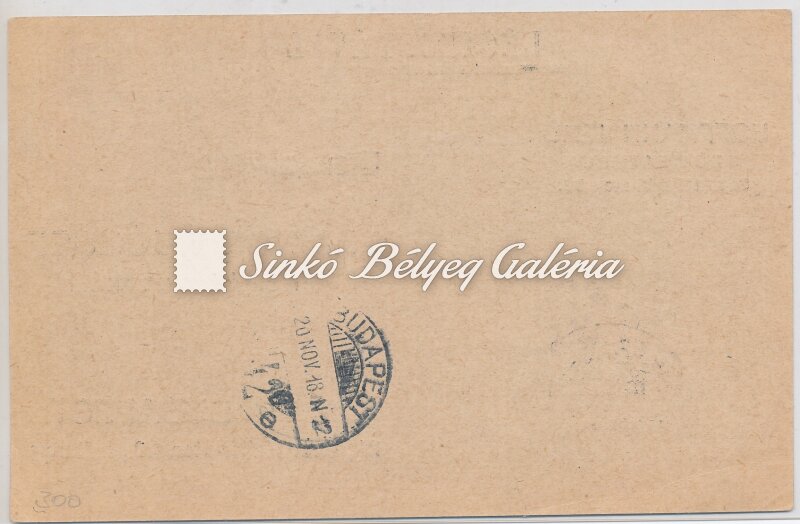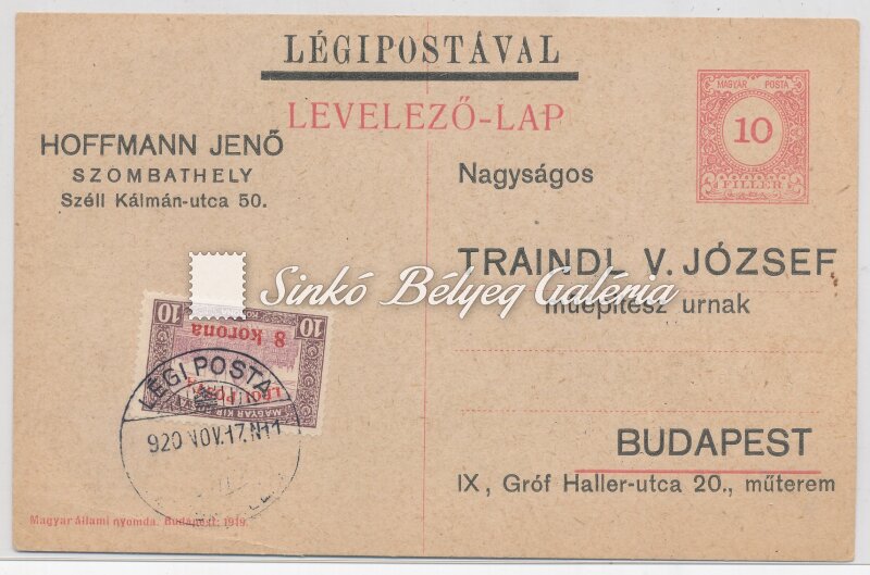 Leírás | 1920.11.17. Légiposta levél SZOMBATHELY-BUDAPEST között. 10f díjjegyes levelezőlap 8+10K bélyegkiegészítéssel bérmentesítve. / 1920.11.17. Airmail letter between SZOMBATHELY-BUDAPEST. 10f postal stationery postcard supplied and franked with 8+10K stamps. |