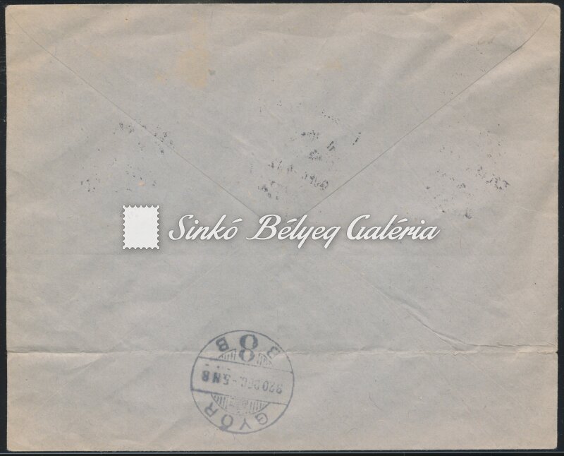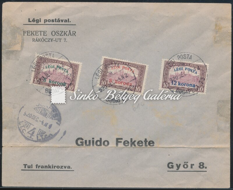 Leírás | 1920.12.04. Légiposta levél BUDAPEST-GYŐR között. Teljes sorozat levélen, érkezési bélyegzővel! / 1920.12.04. Airmail letter between BUDAPEST-GYOR. The complete set on letter, with arriving cancellation! |