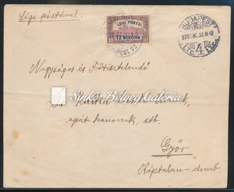 Leírás | 1920.12.30. Légiposta levél BUDAPEST-GYŐR között. 10K/12K bélyeggel bérmentesítve. / 1920.12.30. Airmail letter between BUDAPEST-GYOR. Franked with a 10K/12K stamp. |