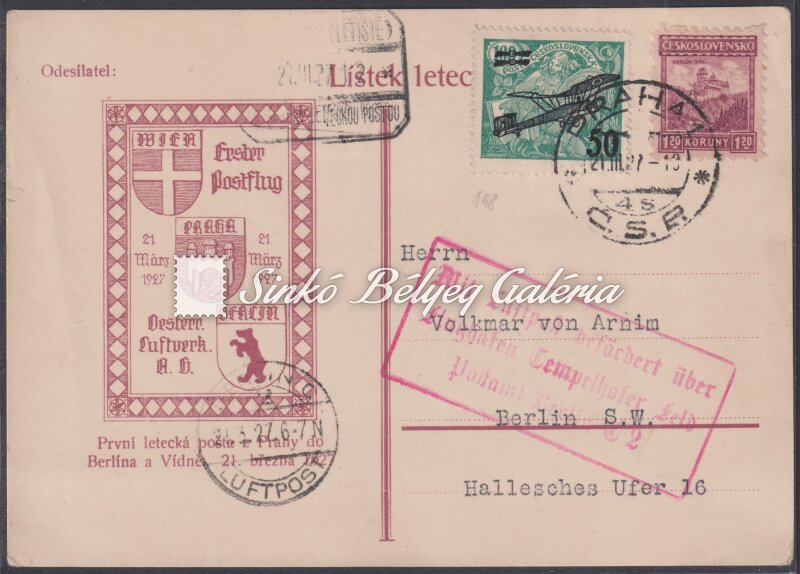 1927. Első légiposta Levelező-lap PRAHA-BERLIN