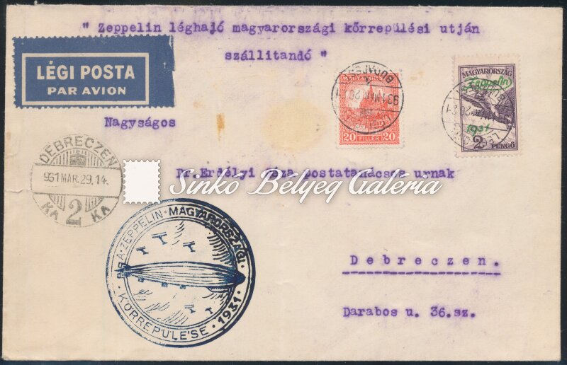 Leírás | 1931.03.26. Légiposta levél BUDAPEST-DEBRECEN között. Zeppelin Magyarországi Körrepülésével. 2P 20f viteldíjjal bérmentesítve. / 1931.03.26. Airmail letter between BUDAPEST-DEBRECEN. On Zeppelin's Hungarian Circular Flight. Franked with 2P 20f fare. |