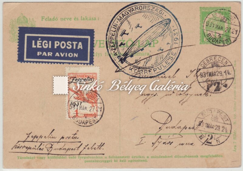 Leírás | 1931.03.28. Légiposta levél. Magyarországi körrepülés, fedélzeti I. és II. típusú bélyegző. / 1931.03.28. Airmail letter. Circular flight in Hungary, with aircraft cancellation type I and II. |