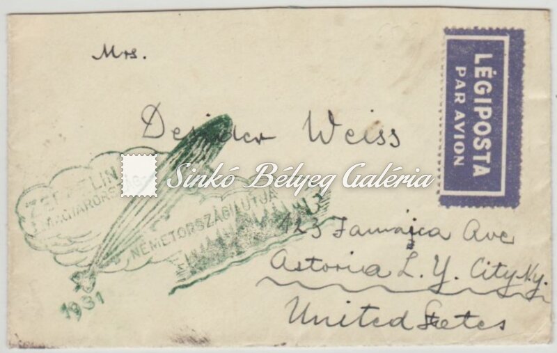 Leírás | 1931.03.28. Légiposta levél BUDAPEST-ASTORIA (New York, USA) küldve. Zeppelin Magyarország-Németország útján, alkalmi zöld bélyegzővel. / 1931.03.28. Airmail letter sent from BUDAPEST-ASTORIA (New York, USA). On Zeppelin's way in Hungary-Germany, with occasional green cancellation. |