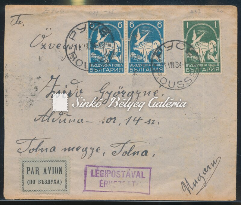 Description | 1934.07.11. Légipostával érkezett levél ROUSSE (BG)-TOLNA között. 11L díjtétellel. / 1934.07.11. Letter arrived via Airmail between ROUSSE (BG)-TOLNA. With 11L fare. |