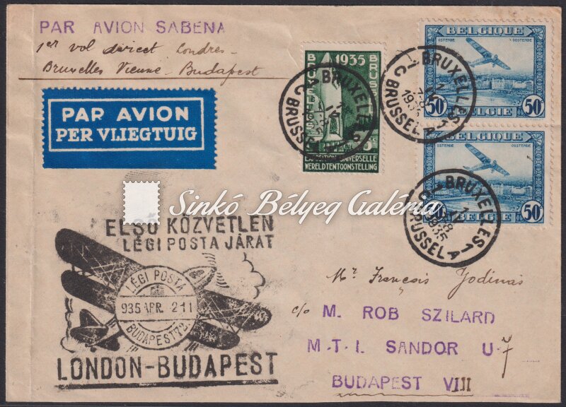 1935.04.01. Légiposta levél az Első Közvetlen Légi Posta Járat LONDON-BUDAPEST