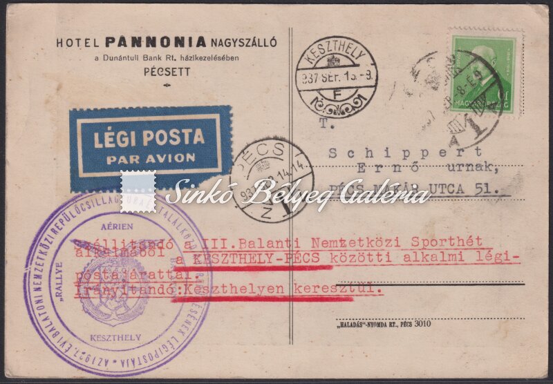 1937.09.08. Légiposta levél PÉCS-KESZTHELY