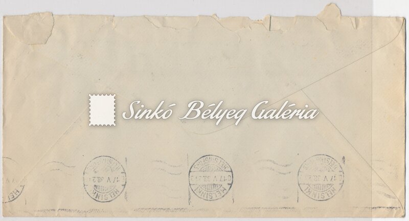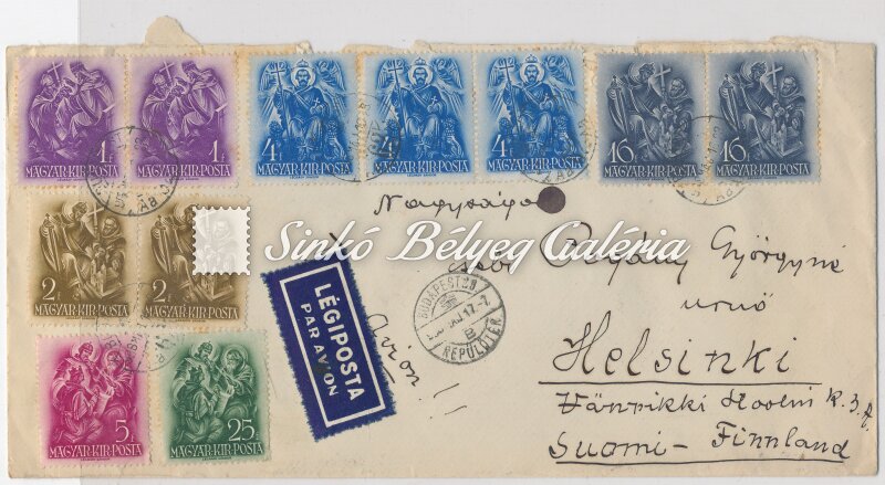 Description | 1938.05.17. Légiposta levél BUDAPEST-HELSINKI között. Szent István (III.) bélyegekkel bérmentesítve, összesen 80f viteldíjjal. / 1938.05.17. Airmail letter between BUDAPEST-HELSINKI. Franked with Saint Stephen (III.) stamps, altogether 80f fare. |