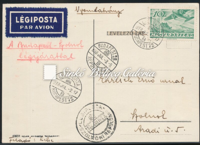 1938.07.03. Légiposta levél BUDAPEST-SZOLNOK