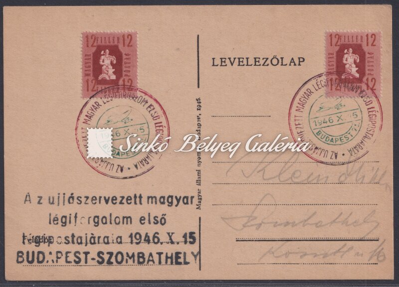Leírás | 1946.10.15. Légiposta levél BUDAPEST-SZOMBATHELY között. Az ujjászervezett magyar légiforgalom első légipostajárata!!! 24f díjtétellel! / 1946.10.15. Airmail letter between BUDAPEST-SZOMBATHELY. The first airmail flight of the newly organised Hungarian air traffic!!! With 24f fare! |