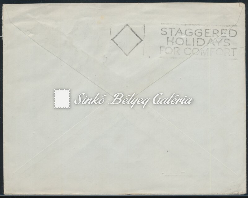 Leírás | 1947.03.13. Ajánlott légiposta levél BUDAPEST-HONLEY (ENG) között. 1,80Ft díjtétellel. Többes és színes bérmentesítés. Hátoldalon Angliában rányomott reklámbélyezés: STAGGERED HOLIDAYS FOR COMFORT. / 1947.03.13. Registered airmail letter between BUDAPEST-HONLEY (ENG). With 1,80Ft fare. Multiple and colourful franking. Advertising stamped in England on back: STAGGERED HOLIDAYS FOR COMFORT. |