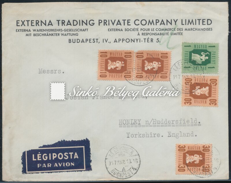 1947.03.13. Ajánlott légiposta levél BUDAPEST-HONLEY
