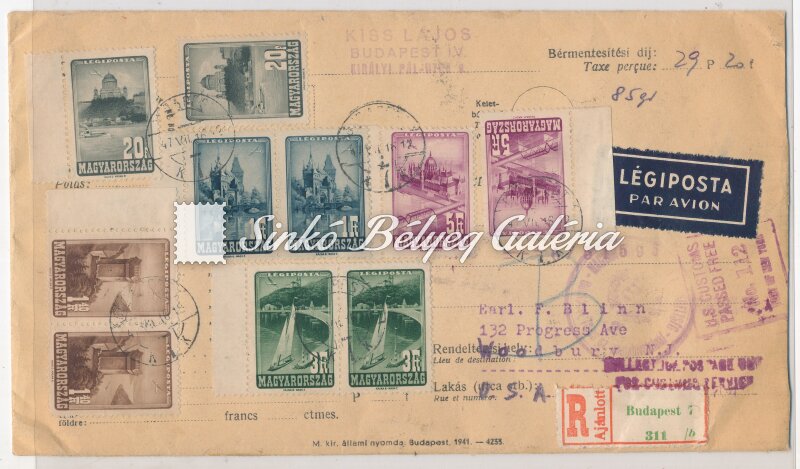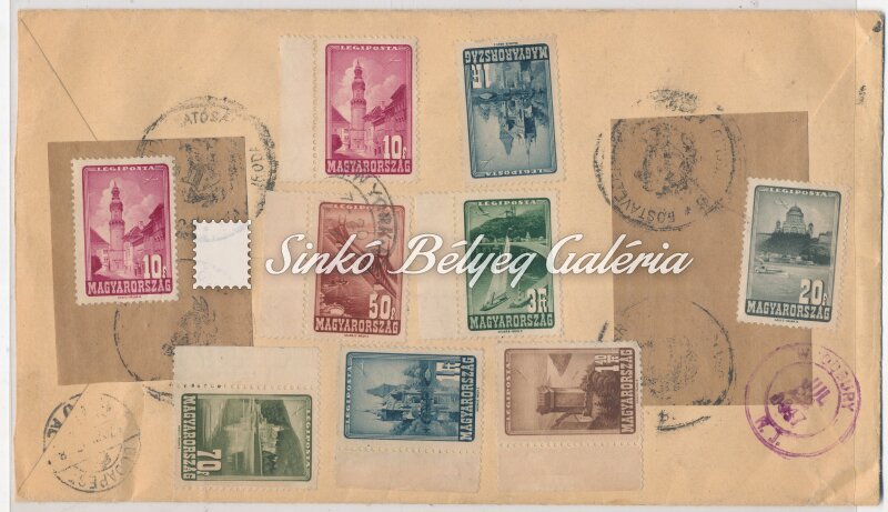 Leírás | 1947.07.16. Ajánlott légiposta levél BUDAPEST-WOODBURY(USA) között. M. kir. Posta értéklevél borítékban. Többes, színes bérmentesítés 29,20Ft díjtétellel. Az 1947. Repülő (IV.) - L sorozatból felhasznált bélyegekkel, 2x5Ft, 3x3Ft, 3x1,40Ft, 4x1Ft, 70f, 50f, 3x20f címletekkel bérmentesítve. A boríték előoldalán US. Post lila szímű vámbélyegző. / 1947.07.16. Registered airmail letter between BUDAPEST-WOODBURY(USA). In Hun.roy. Post registered parcel envelope. Multiple, colourful franking, 29,20Ft fare. Franked with 2x5Ft, 3x3Ft, 3x1,40Ft, 4x1Ft, 70f, 50f, 3x20f values of the 1947. Airplane (IV.) - L set. With purple US.Post custom stamping on the front page of the envelope. |