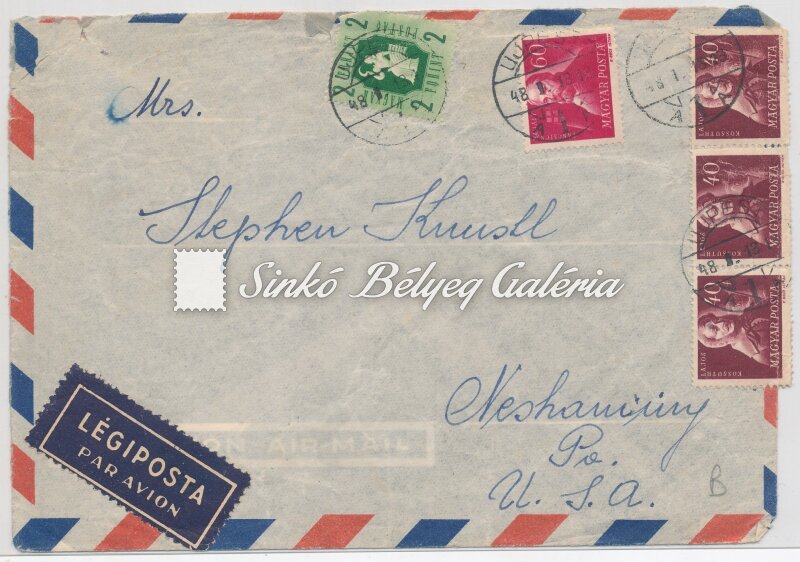 Leírás | 1948.01.13. Légiposta levél ÚJPEST-NESHAMINY (Pennsylvania, USA) között. 3Ft 80f vitedíjjal bérmentesítve. / 1948.01.13. Airmail letter between UJPEST-NESHAMINY (Pennsylvania, USA) Franked with 3Ft 80f fare. |