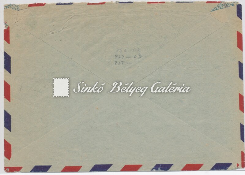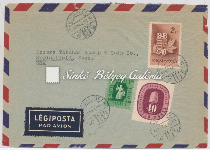 Leírás | 1948.05.20. Légiposta levél BUDAPEST-SPRINGFIELD(USA) között. 3,80Ft díjtétellel. Vegyes és színes bérmentesítés 40f bélyeggel az 1947. Takarékosság sorból, 1,40Ft bélyeggel az 1946. Forint-Fillér sorból továbbá 2Ft bélyeggel az 1948. Centenárium sorozatból. / 1948.05.20. Airmail letter between BUDAPEST-SPRINGFIELD(USA). 3,80Ft fare. Mixed and colourful franking with 40f stamp from the 1947. Saving set, 1,40Ft stamp of the 1946. Forint-Filler set furthermore a 2Ft stamp of the 1948. Centenary set. |