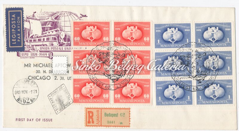 Leírás | 1949.11.01. Ajánlott légiposta levél BUDAPEST-CHICAGO között. Az UPU bélyegfüzetből kitépett 60f és 1Ft 6-os tömb bélyegekkel bérmentesítve FDC-n. Alkalmi bélyegővel. / 1949.11.01. Registered airmail letter between BUDAPEST-CHICAGO. Franked with the 60f and 1Ft blocks of 6 torn out of the UPU stamp booklet, on FDC. With occasional cancellation. |