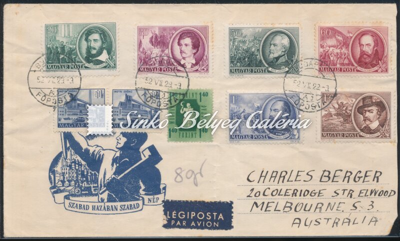 Leírás | 1952.07.28. Légiposta levél BUDAPEST-MELBOURNE (AU) között. 6,50Ft díjtétellel, vegyesen bérmentesítve. / 1952.07.28. Airmail letter between BUDAPEST-MELBOURNE (AU). Mixed franking with 6,50Ft fare. |