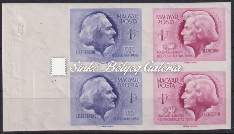 Leírás | 1956. Bélyegnap (29.) Ívszéli párban. Felszúrási ponttal! / 1956. Stamp Day (29.) In pair from the margin of the sheet. With insertion point! |