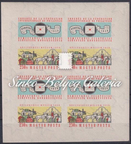 Leírás | 1959. FIP (II.) kisív Katalógus érték: 20.000 HUF / 1959. FIP (II.) miniature sheet Catalogue value: 20.000 HUF |