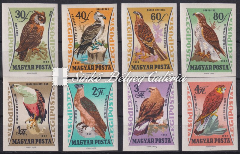 Leírás | 1962. Madarak (IV.) - Ragadozó Madarak - L Katalógus érték: 10.000 HUF / 1962. Birds (IV.) - Birds of Prey - L Catalogue value: 10.000 HUF |