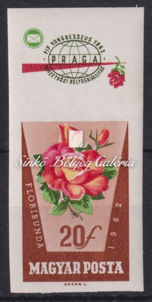 Leírás | 1962. Rózsák (I.) 20f bélyeg felső emblémás ívszéllel! / 1962. Roses (I.) 20f stamp from the upper margin of the sheet, with emblem! |