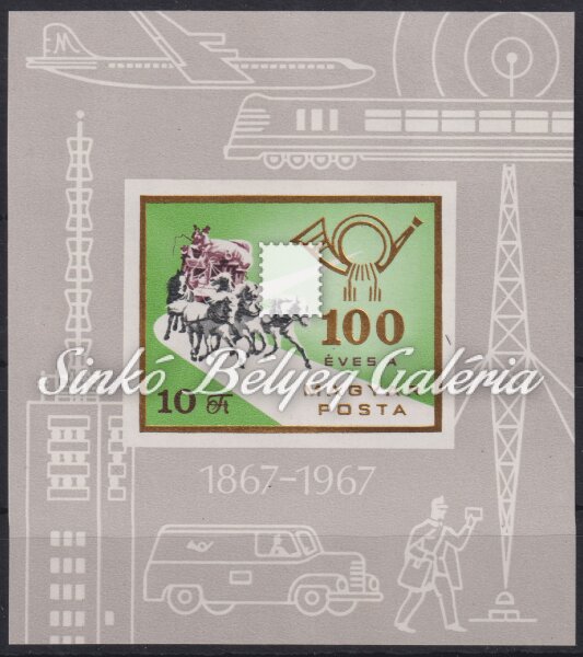 Leírás | 1967. 100 éves a Magyar Posta - Blokk Katalógus érték: 5.000 HUF / 1967. 100 years of the Hungarian Post - Block Catalogue value: 5.000 HUF |