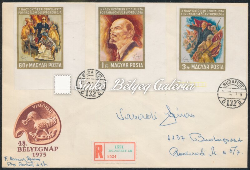 Description | 1975.11.18. Helyi ajánlott levél BUDAPESTen a vágott Nagy Októberi Szocialista Forradalom bélyegsorral bérmentesítve. / 1975.11.18. Local registered letter in BUDAPEST franked with the imperforated Great October Socialist Revolution set. |