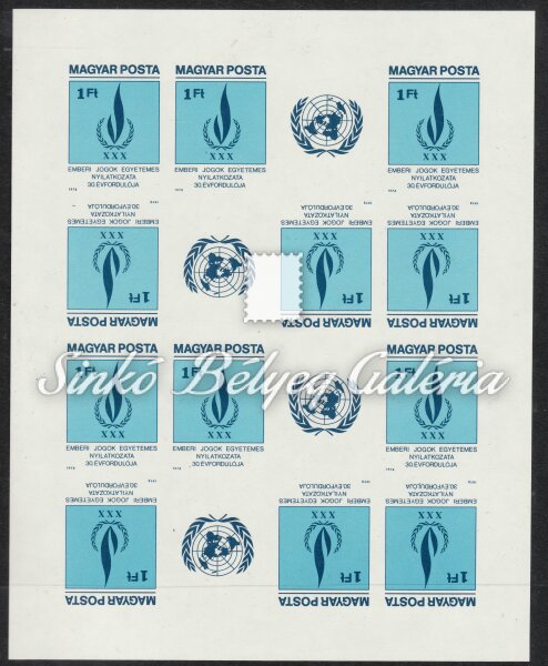 Leírás | 1979. Emberi Jogok Egyetemes Nyilatkozata, vágott teljes ív. Katalógus érték: 12.000 HUF / 1979. Universal Declaration of Human Rights, imperforated full sheet. Catalogue value: 12.000 HUF |