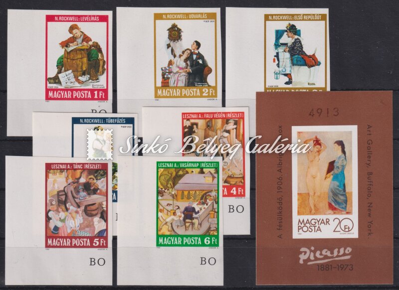 Description | 1981. Festmények (XVIII.) - Híres Illusztrátorok + Festmény (XIX.) - Pablo Picasso - Blokk Ívsarok sor, betű az ívszélen (+200% felár)! Katalógus érték: 23.500 HUF / 1981. Paintings (XVIII.) - Famous Illustrators + Painting (XIX.) - Pablo Picasso - Block Set from the corner of the sheet (+200% surcharge)! Catalogue value: 23.500 HUF |