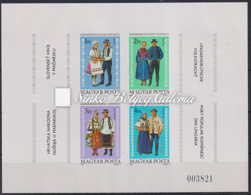 Description | 1981. Magyarországi Nemzetiségek Népviselete - Blokk Katalógus érték: 4.000 HUF / 1981. Traditional costumes of Nationalities in Hungary - Block Catalogue value: 4.000 HUF |