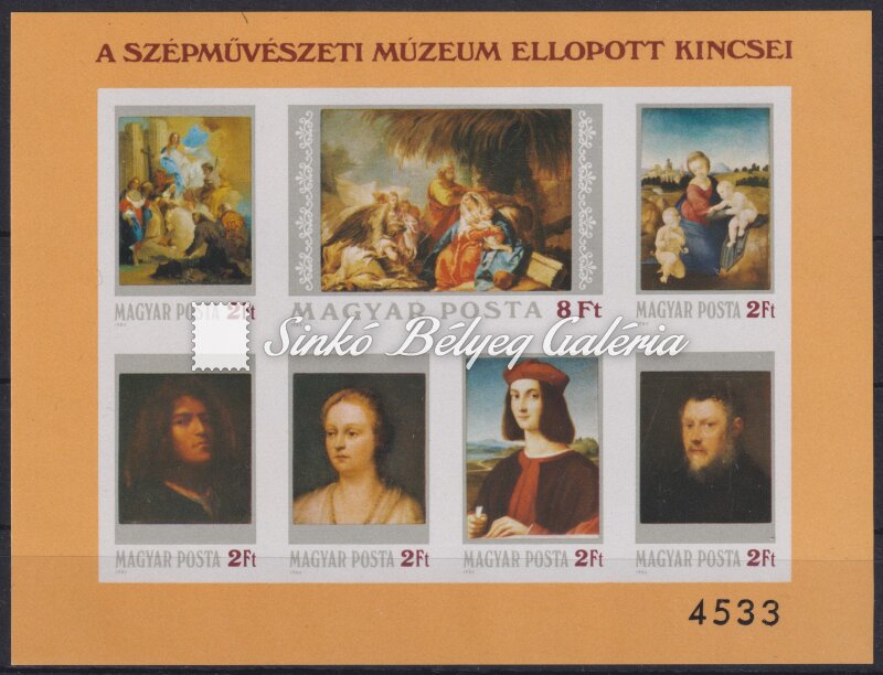Leírás | 1984. Festmény (XXII.) - A Szépművészeti Múzeum ellopott kincsei - Blokk Katalógus érték: 7.000 HUF / 1984. Painting (XXII.) - The stolen treasures of the Museum of Fine Arts - Block Catalogue value: 7.000 HUF |
