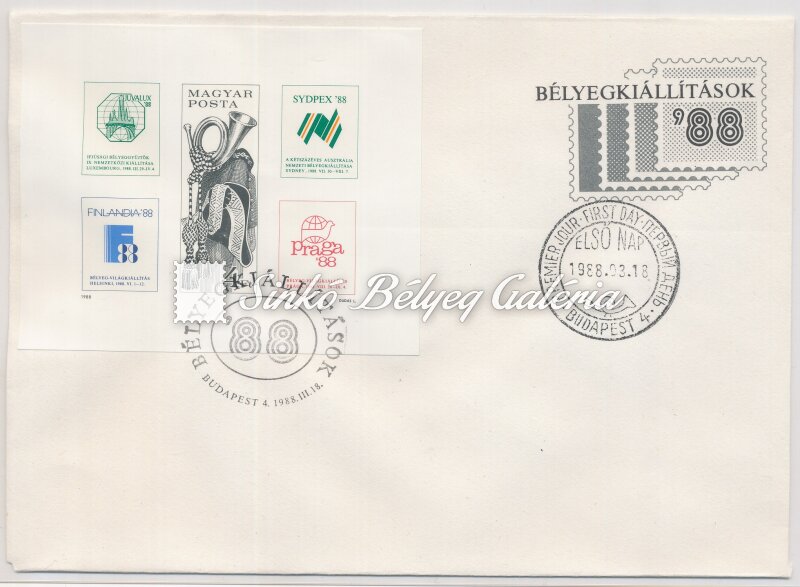 Leírás | 1988. Bélyegkiállítások (III.) - Blokk FDC / 1988. Stamp Exhibitions (III.) - Block FDC |