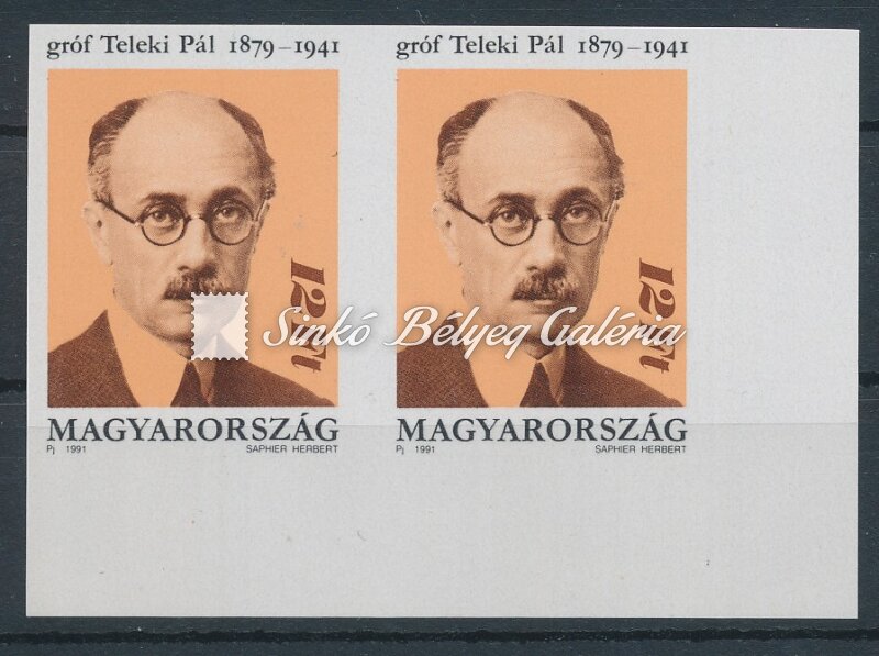Leírás | 1991. Gróf Teleki Pál Ívsarki pár! Katalógus érték: 4.000 HUF / 1991. Count Pal Teleki In pair from the corner of the sheet! Catalogue value: 4.000 HUF |