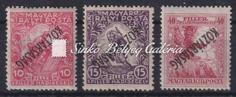 Leírás | 1918. Köztársaság - tévnyomat Hadisegély (III.) sor fordított felülnyomattal! / 1918. Republic - misprint Military Aid (III.) set with reverse overprints! |