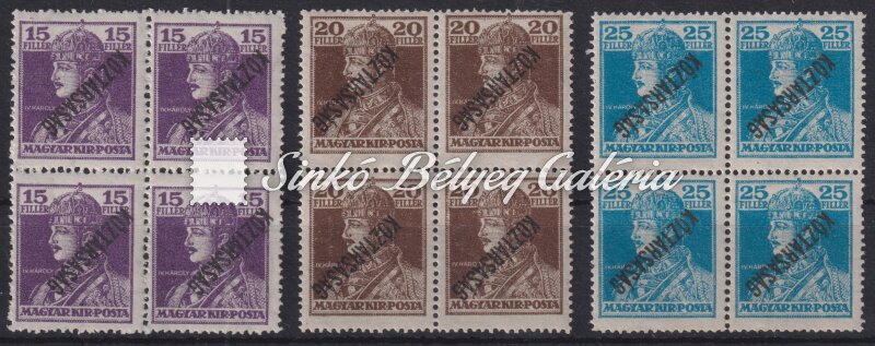 Leírás | 1918. Köztársaság - tévnyomat 15f, 20f, 25f Károly bélyegek 4-es tömbben, fordított felülnyomattal! / 1918. Republic - misprint 15f, 20f, 25f Karoly stamps in blocks of 4, with reverse overprints! |