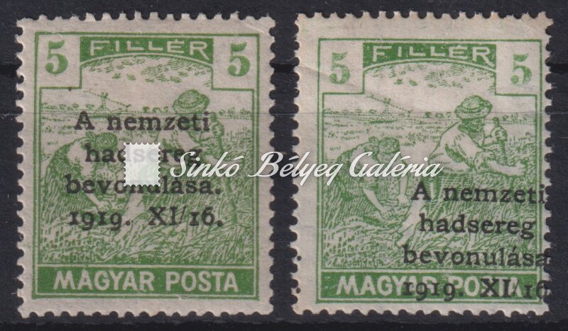 Leírás | 1919. A Nemzeti Hadsereg bevonulása (1919.XI.16.) - tévnyomat 5f SOC.MIS. feliratú bélyegen a felülnyomat jelentős eltolódása! / 1919. Entry of the National Army (1919.XI.16.) - misprint Significantly shifted overprint on 5f stamp with SOC.MIS. subtitle! |