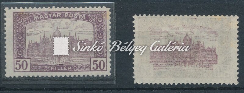 Leírás | 1919. Magyar Posta - tévnyomat 50f bélyeg a középrész teljes gépszínátnyomatával! / 1919. Hungarian Post Office - misprint 50f stamp with the complete machine colour print of the midsection! |