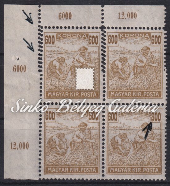 Leírás | 1924. Arató-Parlament - tévnyomat 600K bélyeg ívsarki 4-es tömbben, jobb alsó bélyegén a jobb oldali értékszám 800! Az ívsarokban kettősfogazással! Egyedi tévnyomat! RR! / 1924. Harvsester-Parliament - misprint 600K stamp in a block of 4 from the corner of the sheet, on the lower right stamp the denomination of the right is 800! With double perforation in the corner! Unique misprint! RR! |