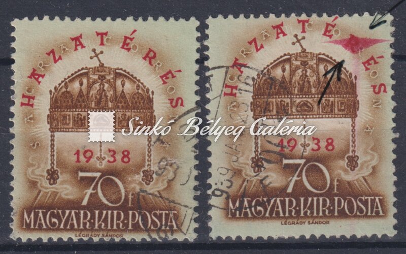 Leírás | 1938. Hazatérés - tévnyomat 70f bélyegen látványos piros festékfolt a felülnyomat "R" betűjénél! / 1938. Homecoming - misprint on 70f stamp there is a red paint spot next to the letter "R" of the overprint! |