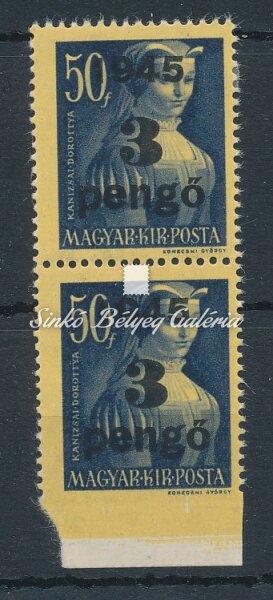 Leírás | 1945. Kisegítő bélyegek (IV.) - tévnyomat 3P/50f bélyegpár alul fogazatlanul! / 1945. Auxiliary stamps (IV.) - misprint 3P/50f stamp pair imperforate below! |