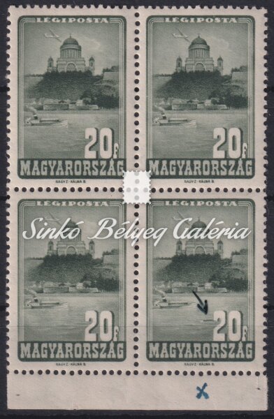 Leírás | 1947. Repülő (IV.) - L - tévnyomat 20f bélyeg 4-es tömbben, egy vízszintes vonal "csónak" van a 2-es számjegynél! / 1947. Airplane (IV.) - L - misprint 20f stamp in a block of 4, there is a horizontal line "boat" by the number 2! |