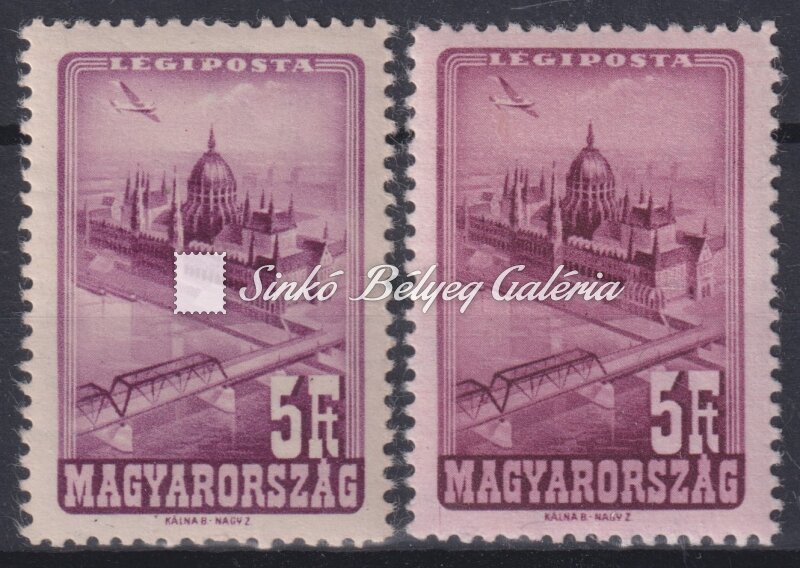 Leírás | 1947. Repülő (IV.) - L - tévnyomat 5Ft bélyegen dupla lila fedő színnyomat! / 1947. Airplane (IV.) - L - misprint 5Ft stamp with double purple colour print! |