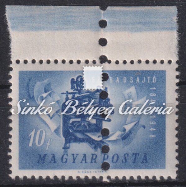 Leírás | 1948. Centenárium - tévnyomat Ívszéli 10f bélyeg megsemmisítő lyukasztással! / 1948. Centenary - misprint 10f stamp from the margin of the sheet, with annulling punching! |