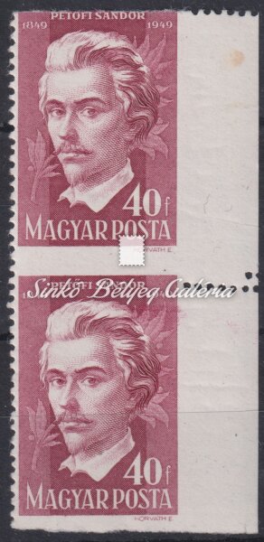 Leírás | 1949. Petőfi Sándor (II.) - tévnyomat Ívszéli 40f bélyegpár látványos elfogazással! / 1949. Sandor Petofi (II.) - misprint 40f stamp pair from the margin of the sheet with spectacularly defective perforation! |