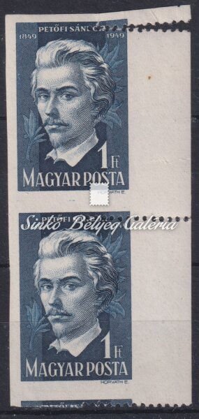 Leírás | 1949. Petőfi Sándor (II.) - tévnyomat Ívszéli 1Ft bélyegpár látványos elfogazással! / 1949. Sandor Petofi (II.) - misprint 1Ft stamp pair from the margin of the sheet with spectacularly defective perforation! |
