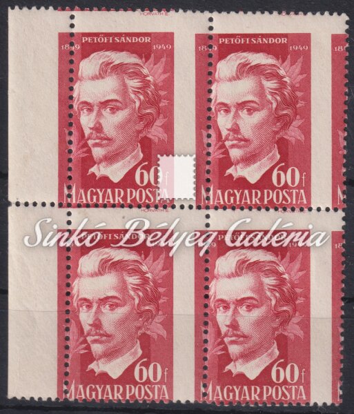 Leírás | 1950. Petőfi Sándor (III.) - tévnyomat 60f bélyeg ívszéli 4-es tömbben, látványosan elfogazva! / 1950. Sandor Petofi (III.) - misprint 60f stamp in a block of 4 from the margin of the sheet, with spectacularly defective perforation! |